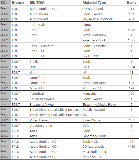 Returns a list of all Bibliographic Type of Material (TOM) and Item Material Type combinations. Useful for identifying cleanup candidates.
