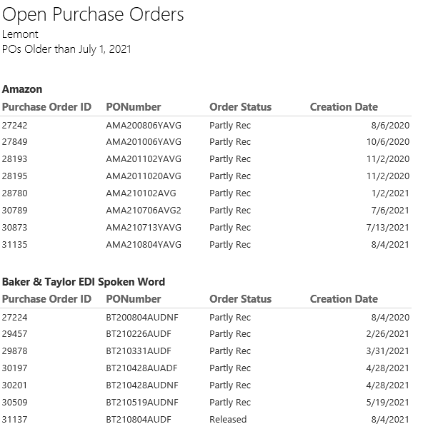 - When the report is exported to Excel, the first column in each row can be used as an Item SQL Search to identify titles in the system.