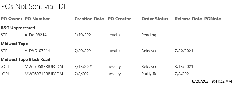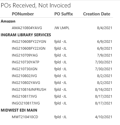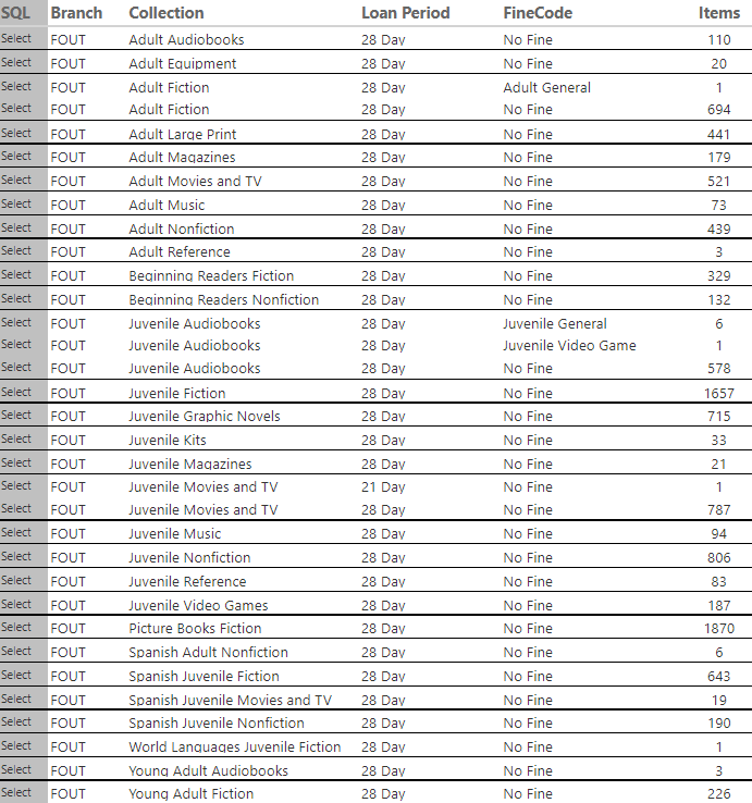 - When the report is exported to Excel, the first column in each row can be used as an Item SQL Search to identify titles in the system.